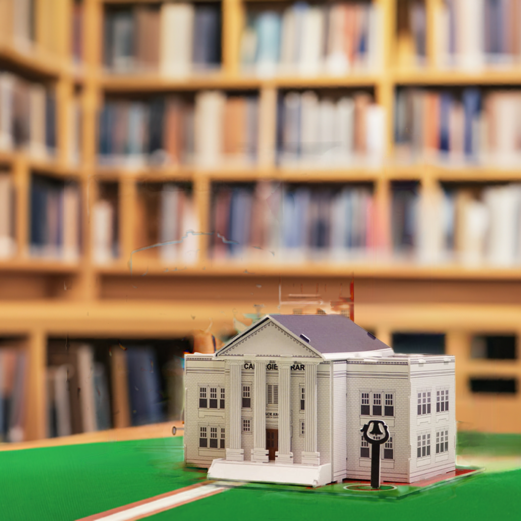 Blueprint, foam 3D puzzle of library, fact cards about each college and university, architect pencil, school-themed drafting pad.