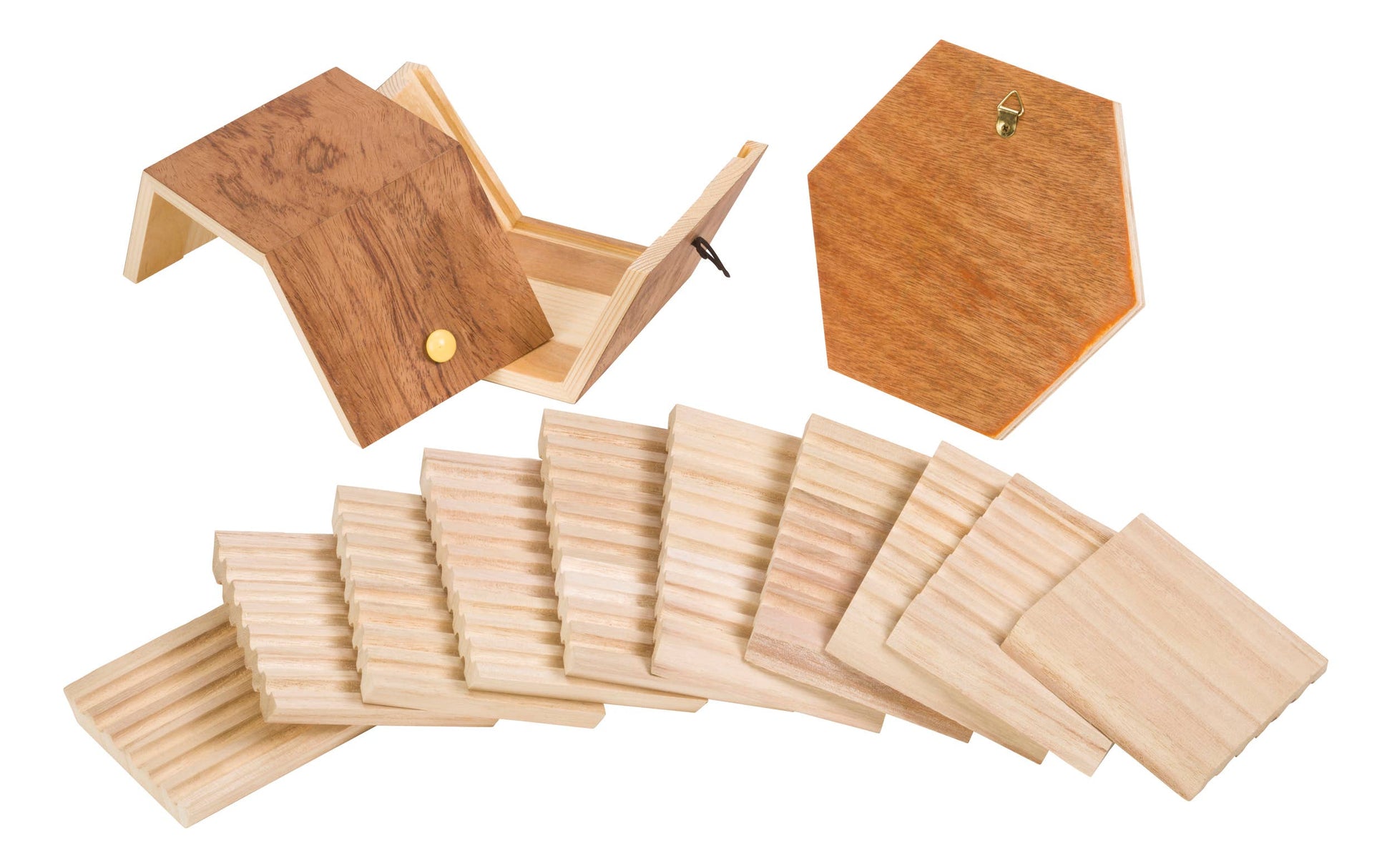 The popular Beetle & Bee Garden Solitary Bee Habitat kit includes a wooden bee habitat with holes and instructions. Measures 7.5 x 4.5 x 6.5 inches. A high-quality hexagon-shaped structure, this bee habitat attracts non-swarming bee species like the mason bee to nest and raise their young. Each bee habitat is made of eco-friendly FSC-certified wood that ensures environmental and economic sustainability. The habitat comes apart for easy cleaning, but parental supervision is recommended before doing so.