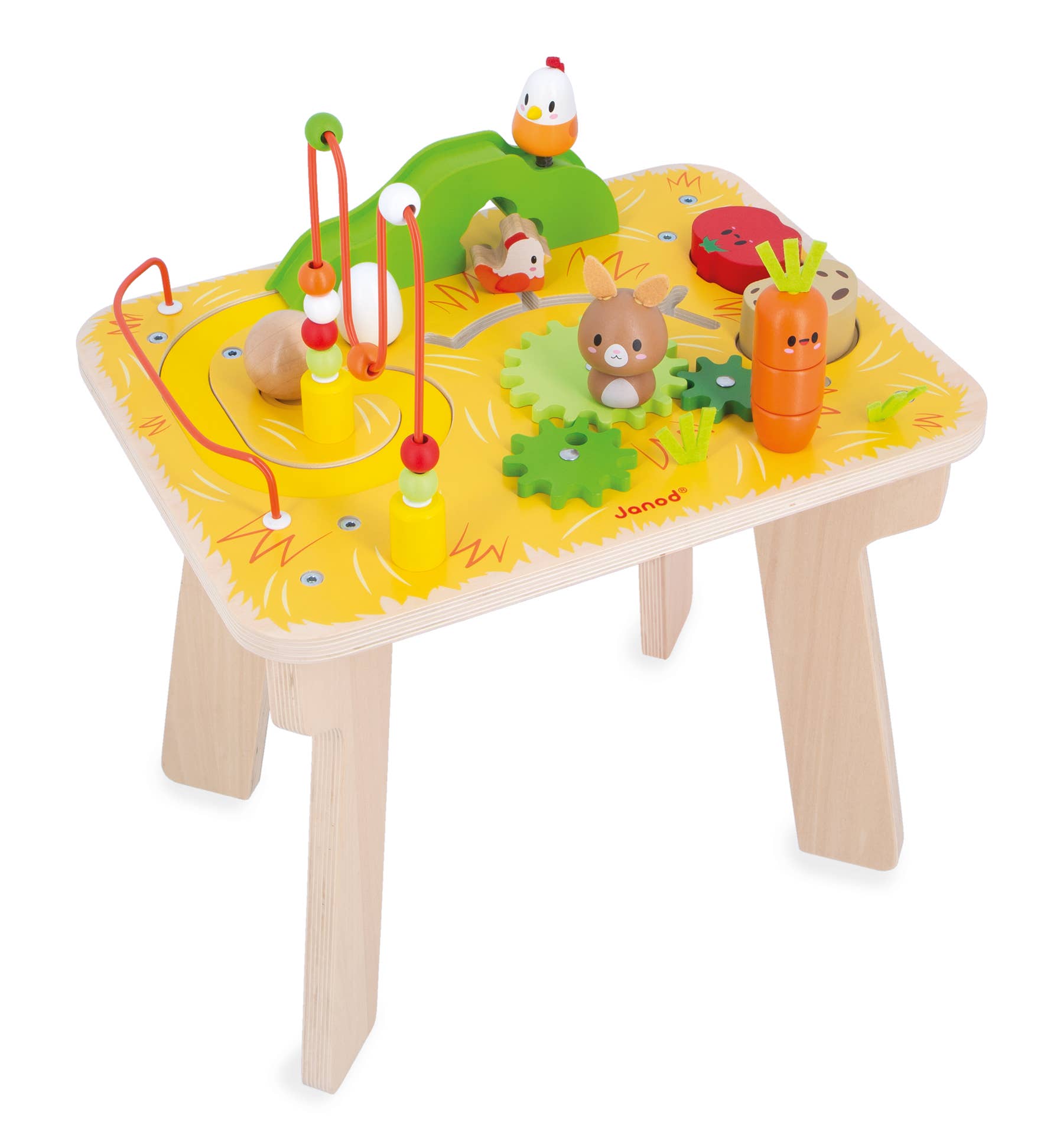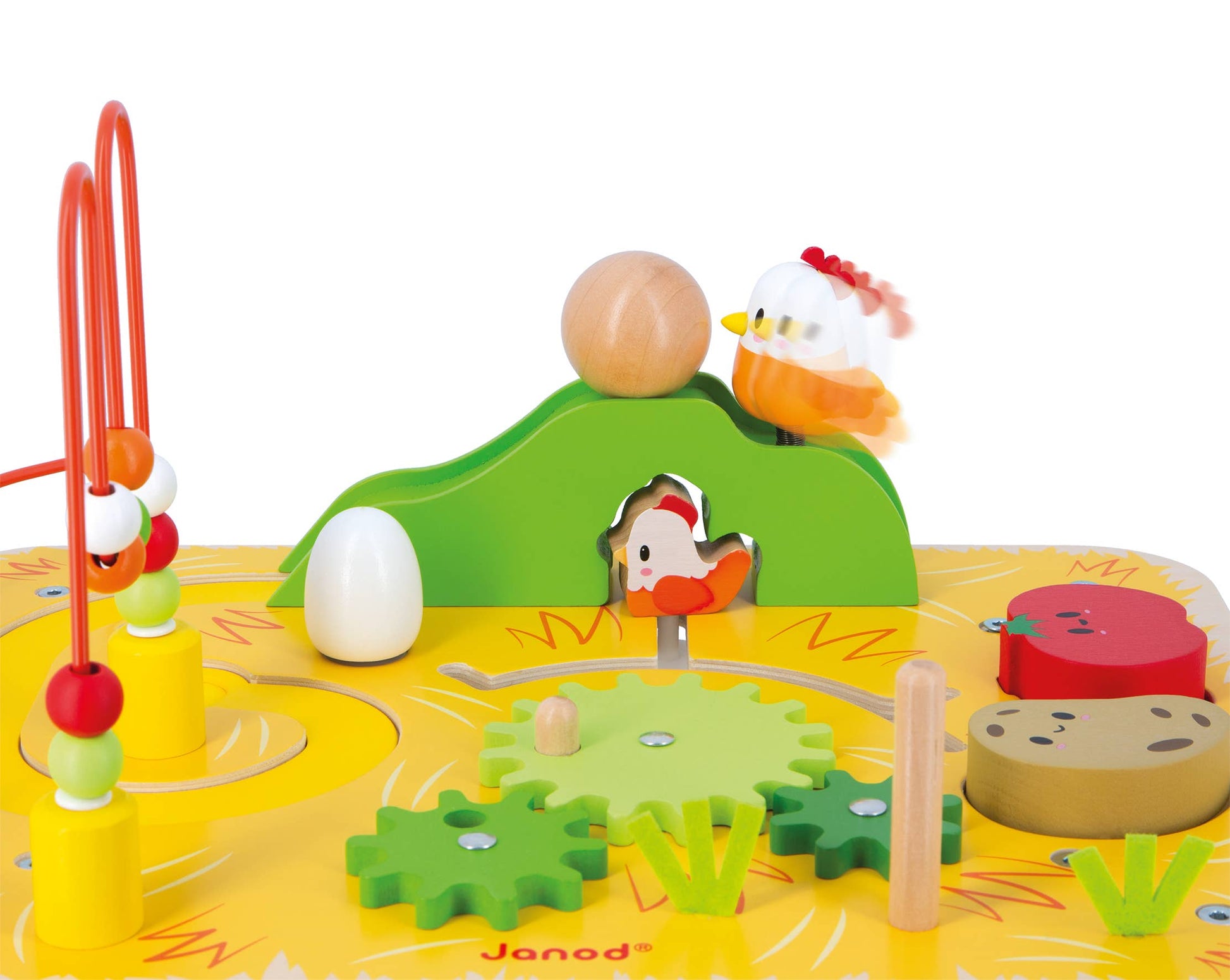 Welcome to the farm! Come and discover the animals and activities! Your child will meet a spring-loaded chicken that releases a wooden ball, and a chicken that moves through its maze and hides under the green hill. They'll also discover a rotating egg with sound and a removable rabbit that operates the gears. In the garden, they can stack the 3 pieces of a friendly carrot and learn about potatoes and tomatoes. Last but not least, they'll be able to play with the colorful bead maze without ever getting bored. All these activities develop your child's visual-spatial and fine motor skills. For children aged 12 months and up.