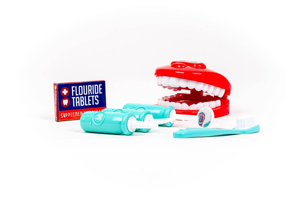 Help little ones explore dentistry with the My World My Play Dentist Set. Includes a set of model teeth, toothbrush, dental pick, drill, and mirror. All items are made of plastic and for pretend and play use only. Set of model teeth is red with white teeth. Tools are blue and white. A perfect gift for an aspiring dentist.